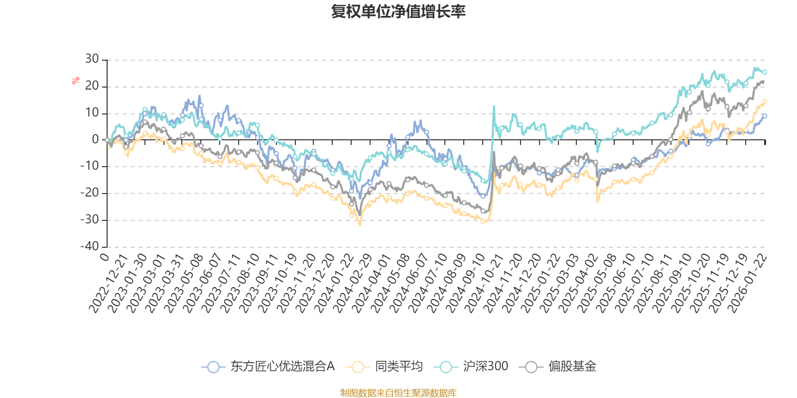 截至1月22日,东方匠心优选混合A近三个月复权单位净值增长率为10.53%,位于同类可比基金302/689;近半年复权单位净值增长率为13.06%,位于同类可比基金523/689;近一年复权单位净值增长率为22.58%,位于同类可比基金539/673;近三年复权单位净值增长率为-0.27%,位于同类可比基金294/396。