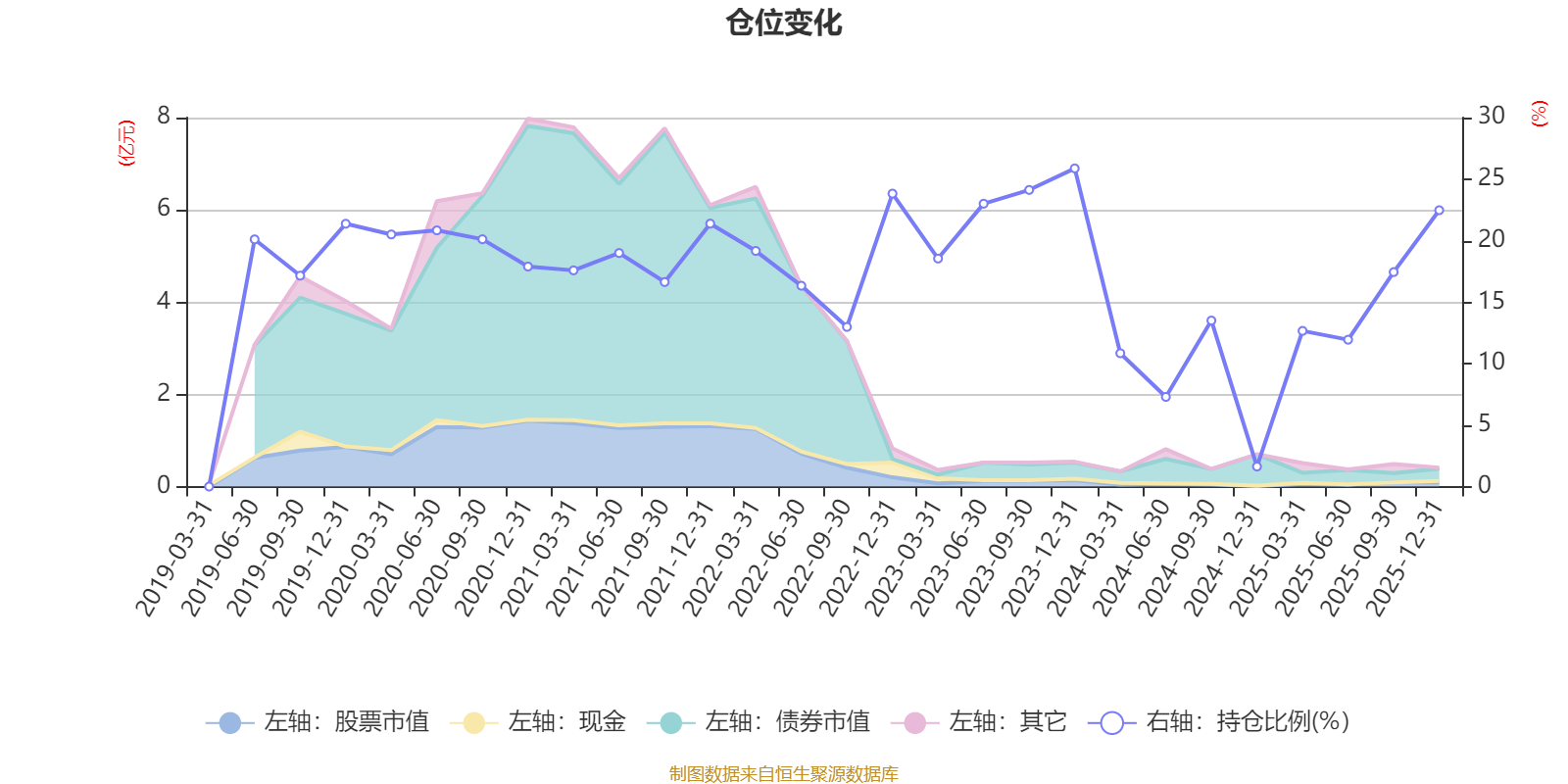 据定期报告数据统计,近三年平均股票仓位为15.78%,同类平均为72.57%。2023年末基金达到25.87%的最高仓位,2024年末最低,为1.63%。