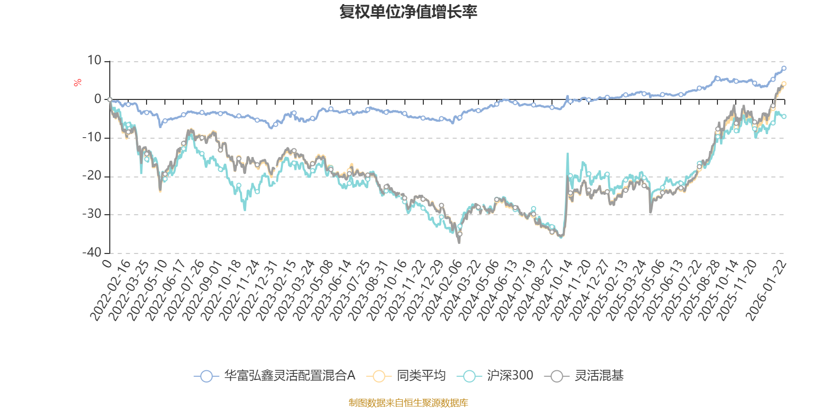 截至1月22日,华富弘鑫灵活配置混合A近三个月复权单位净值增长率为3.35%,位于同类可比基金957/1286;近半年复权单位净值增长率为5.01%,位于同类可比基金1067/1286;近一年复权单位净值增长率为7.63%,位于同类可比基金1138/1286;近三年复权单位净值增长率为12.58%,位于同类可比基金728/1286。