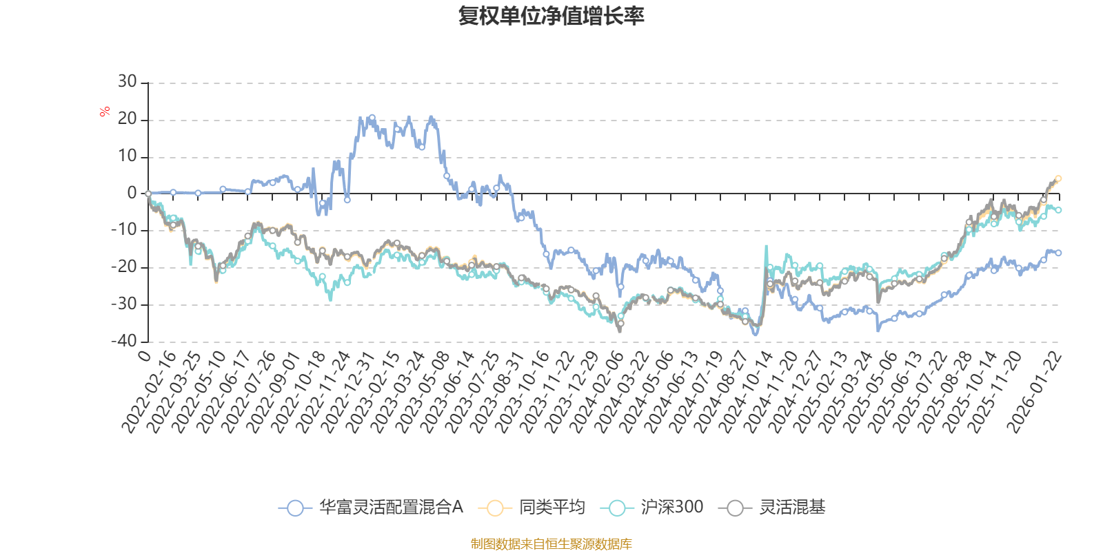 截至1月22日,华富灵活配置混合A近三个月复权单位净值增长率为4.61%,位于同类可比基金878/1286;近半年复权单位净值增长率为15.52%,位于同类可比基金803/1286;近一年复权单位净值增长率为25.98%,位于同类可比基金793/1286;近三年复权单位净值增长率为-28.57%,位于同类可比基金1258/1286。