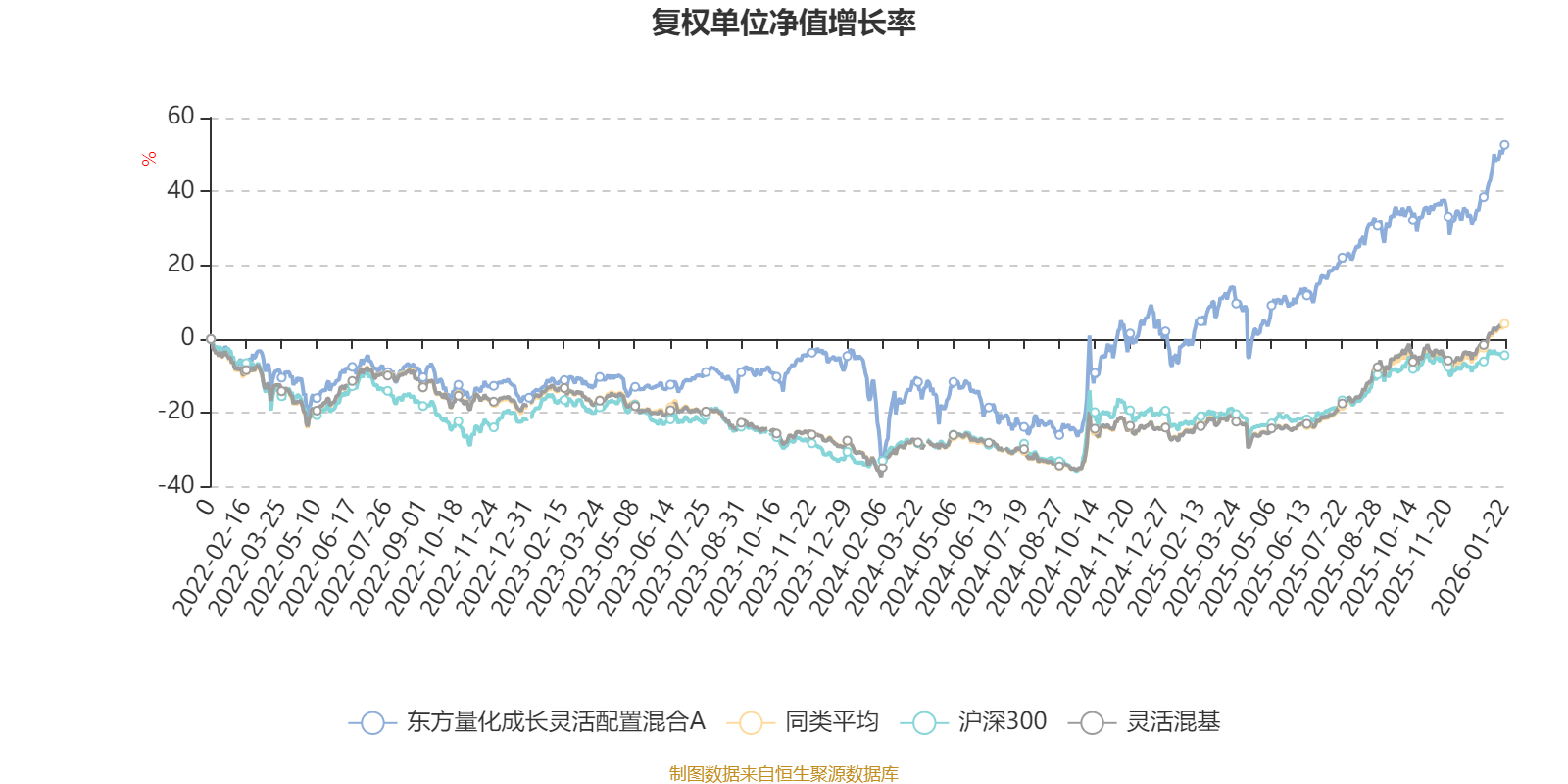 截至1月22日,东方量化成长灵活配置混合A近三个月复权单位净值增长率为14.81%,位于同类可比基金295/1286;近半年复权单位净值增长率为25.04%,位于同类可比基金548/1286;近一年复权单位净值增长率为54.86%,位于同类可比基金270/1286;近三年复权单位净值增长率为71.60%,位于同类可比基金78/1286。