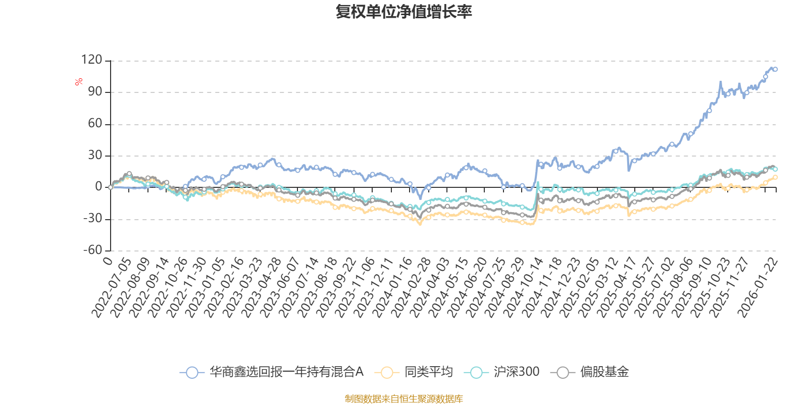 截至1月22日,华商鑫选回报一年持有混合A近三个月复权单位净值增长率为12.88%,位于同类可比基金171/621;近半年复权单位净值增长率为42.98%,位于同类可比基金89/621;近一年复权单位净值增长率为78.17%,位于同类可比基金36/613;近三年复权单位净值增长率为82.18%,位于同类可比基金23/535。