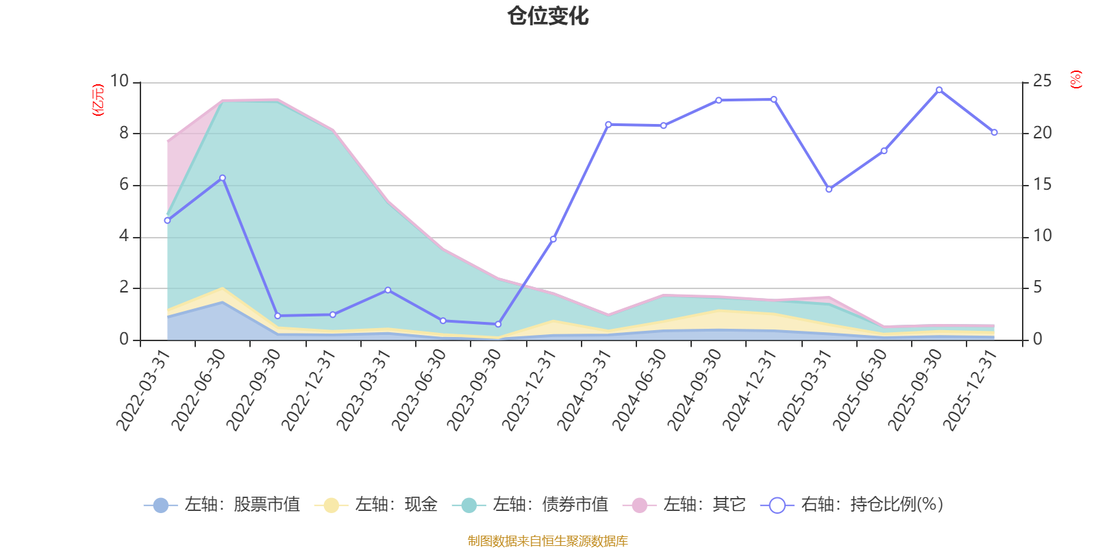据定期报告数据统计,近三年平均股票仓位为15.31%,同类平均为19.2%。2025年三季度末基金达到24.26%的最高仓位,2023年三季度末最低,为1.54%。