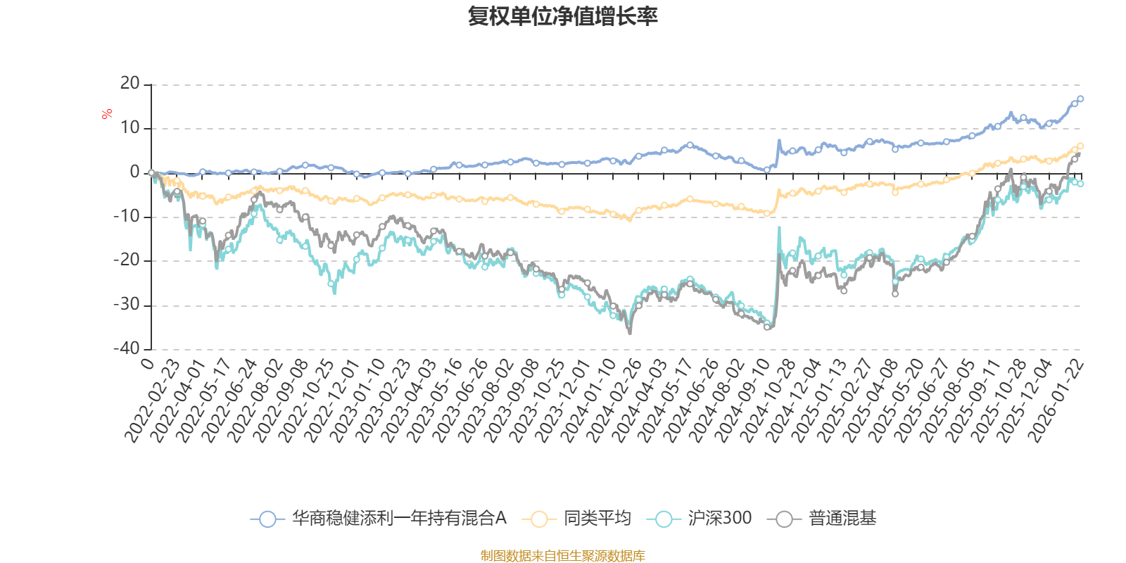 截至1月22日,华商稳健添利一年持有混合A近三个月复权单位净值增长率为4.56%,位于同类可比基金92/629;近半年复权单位净值增长率为8.07%,位于同类可比基金116/629;近一年复权单位净值增长率为10.95%,位于同类可比基金178/626;近三年复权单位净值增长率为16.89%,位于同类可比基金141/564。