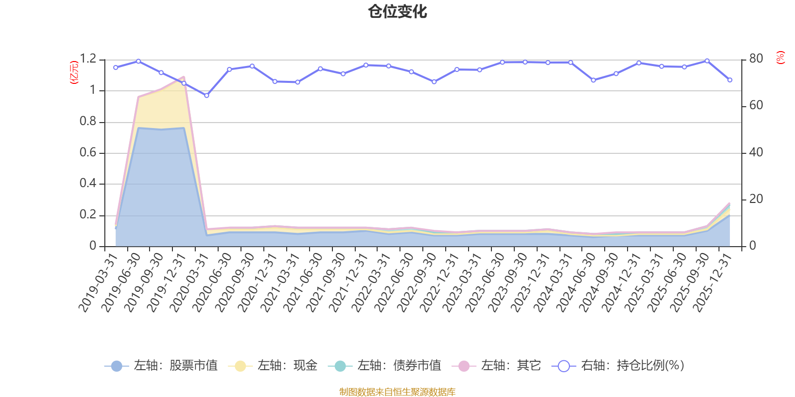 据定期报告数据统计,近三年平均股票仓位为76.6%,同类平均为72.57%。2025年三季度末基金达到79.44%的最高仓位,2020年一季度末最低,为64.61%。
