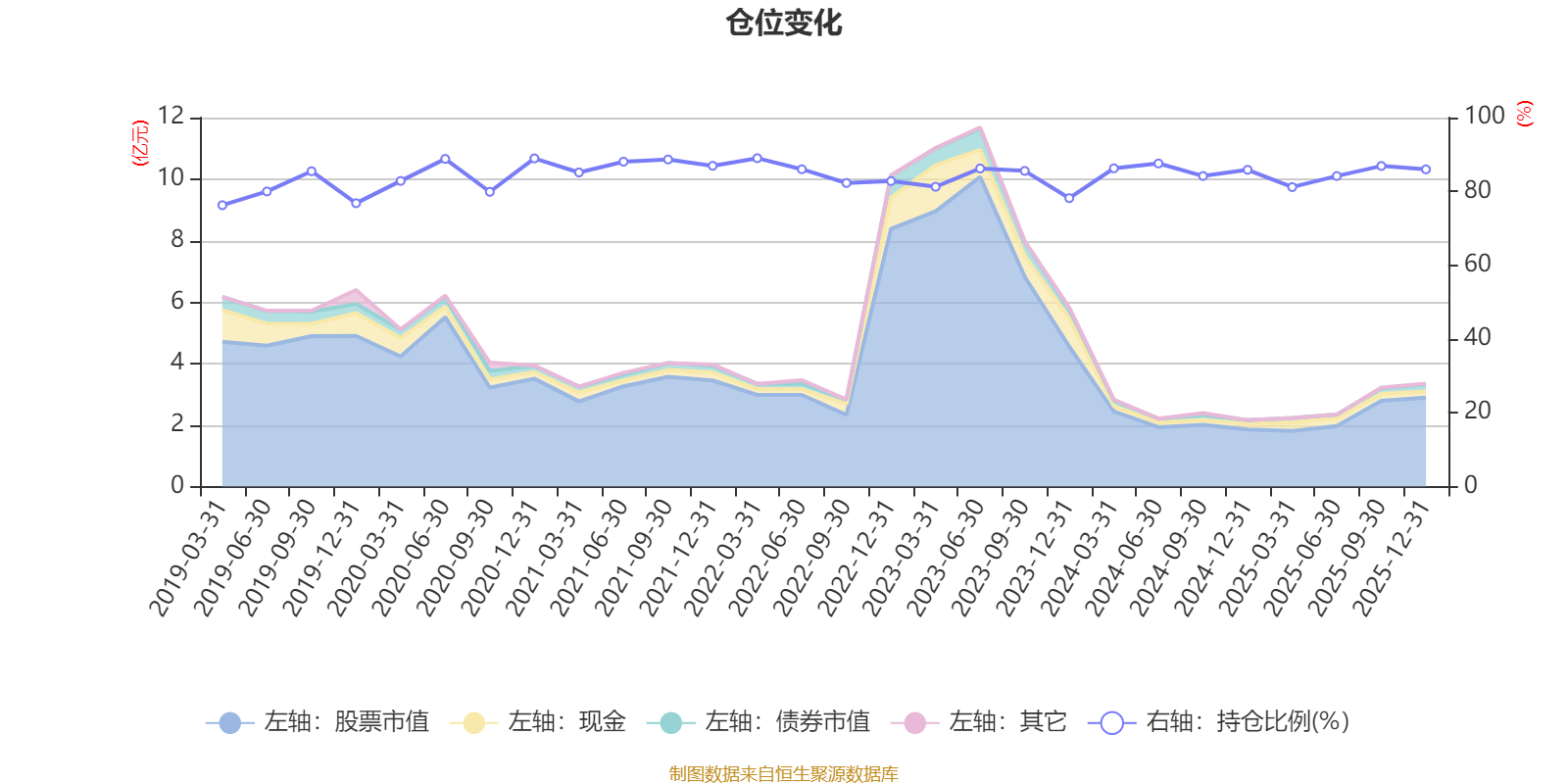据定期报告数据统计,近三年平均股票仓位为84.44%,同类平均为72.57%。2022年一季度末基金达到89%的最高仓位,2019年一季度末最低,为76.26%。