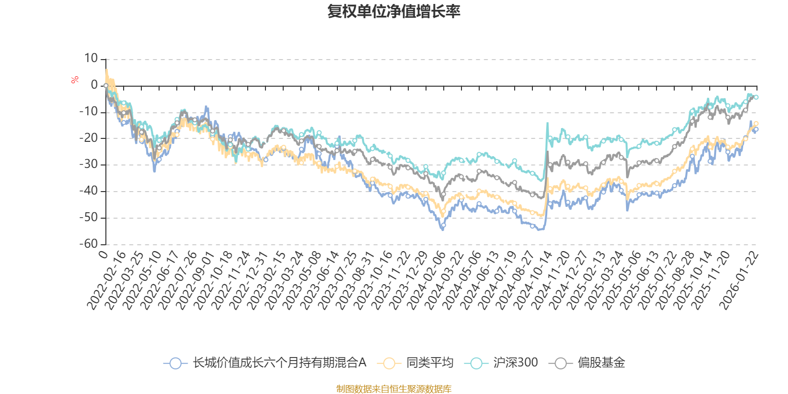 截至1月22日,长城价值成长六个月持有期混合A近三个月复权单位净值增长率为15.32%,位于同类可比基金112/621;近半年复权单位净值增长率为34.21%,位于同类可比基金174/621;近一年复权单位净值增长率为46.88%,位于同类可比基金224/613;近三年复权单位净值增长率为9.98%,位于同类可比基金324/535。