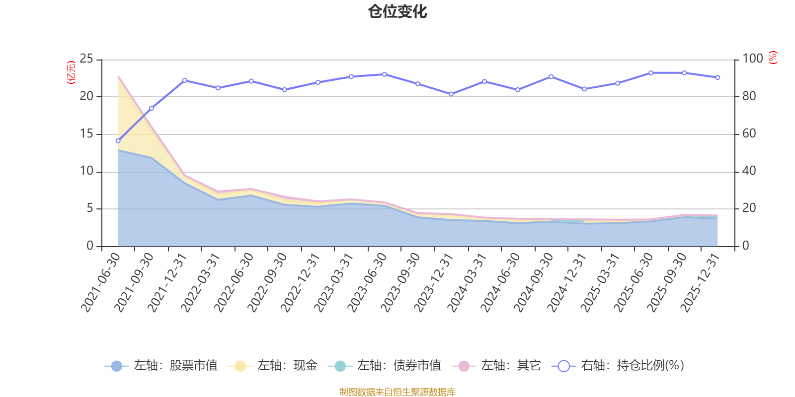 据定期报告数据统计,近三年平均股票仓位为88.52%,同类平均为85.83%。2025年三季度末基金达到92.91%的最高仓位,2021年上半年末最低,为56.51%。