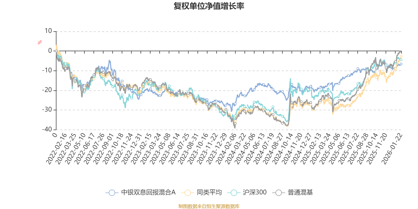 截至1月22日,中银双息回报混合A近三个月复权单位净值增长率为1.35%,位于同类可比基金118/134;近半年复权单位净值增长率为2.56%,位于同类可比基金127/134;近一年复权单位净值增长率为17.21%,位于同类可比基金100/131;近三年复权单位净值增长率为16.05%,位于同类可比基金66/124。
