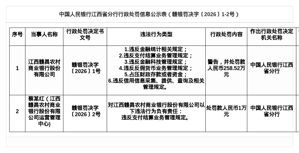 江西赣昌农商行被罚258.52万,涉多项违规