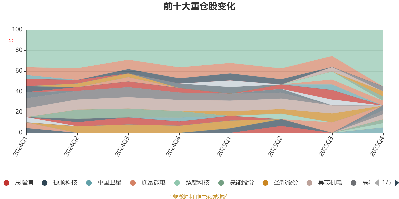 截至2025年四季度末,基金十大重仓股分别是中国卫星、迈为股份、昊志机电、中微公司、上海瀚讯、国博电子、航天工程、臻镭科技、高华科技、豪能股份。