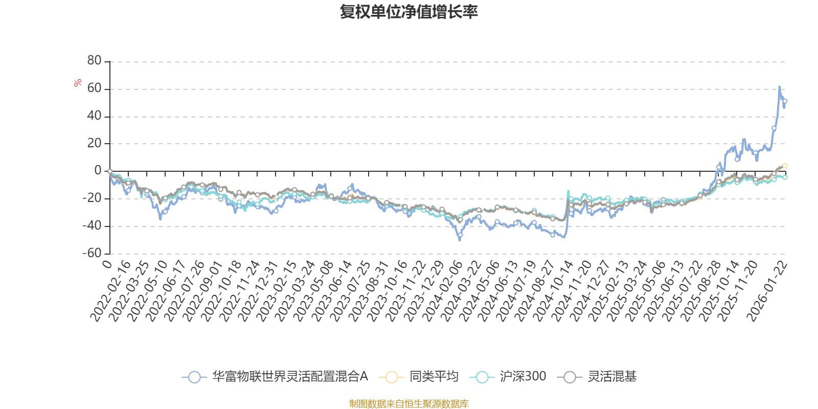 截至1月22日,华富物联世界灵活配置混合A近三个月复权单位净值增长率为32.46%,位于同类可比基金26/1286;近半年复权单位净值增长率为84.66%,位于同类可比基金10/1286;近一年复权单位净值增长率为107.94%,位于同类可比基金12/1286;近三年复权单位净值增长率为87.07%,位于同类可比基金45/1286。