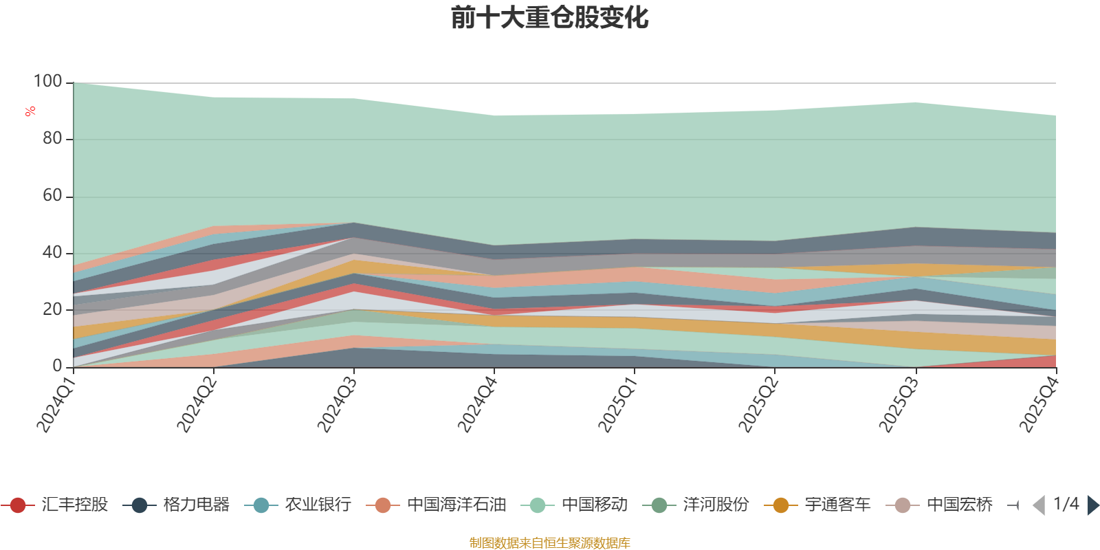 截至2025年四季度末,基金十大重仓股分别是美的集团、长江电力、宇通客车、工商银行、建设银行、中国宏桥、汇丰控股、中国银行、中国平安、中国神华。