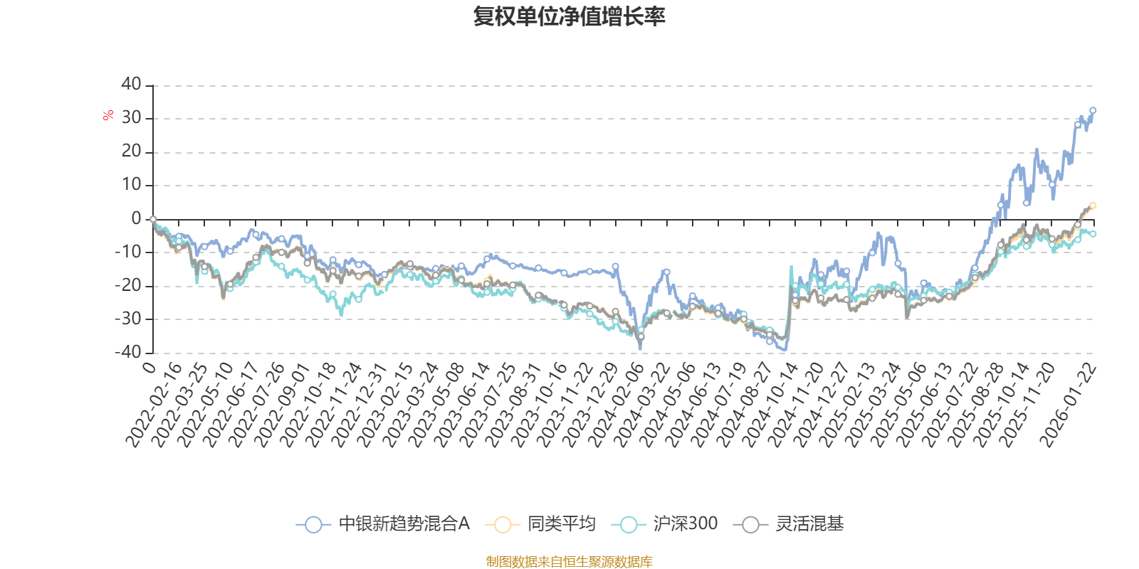 截至1月22日,中银新趋势混合A近三个月复权单位净值增长率为21.82%,位于同类可比基金107/1286;近半年复权单位净值增长率为55.07%,位于同类可比基金119/1286;近一年复权单位净值增长率为52.63%,位于同类可比基金299/1286;近三年复权单位净值增长率为56.15%,位于同类可比基金147/1286。