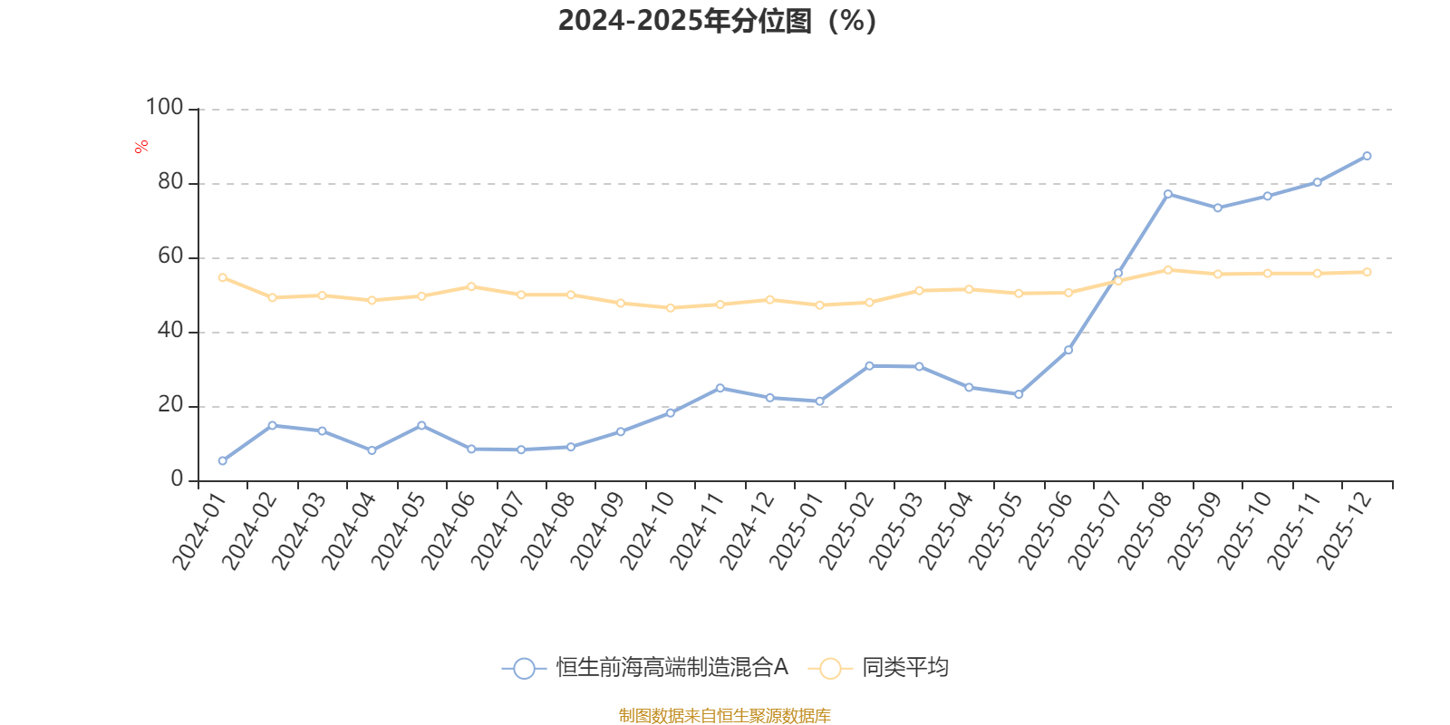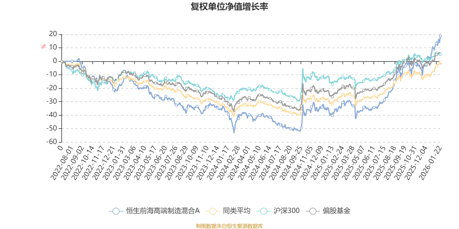 截至1月22日,恒生前海高端制造混合A近三个月复权单位净值增长率为25.05%,位于同类可比基金36/689;近半年复权单位净值增长率为62.63%,位于同类可比基金30/689;近一年复权单位净值增长率为84.71%,位于同类可比基金29/673;近三年复权单位净值增长率为40.11%,位于同类可比基金66/396。