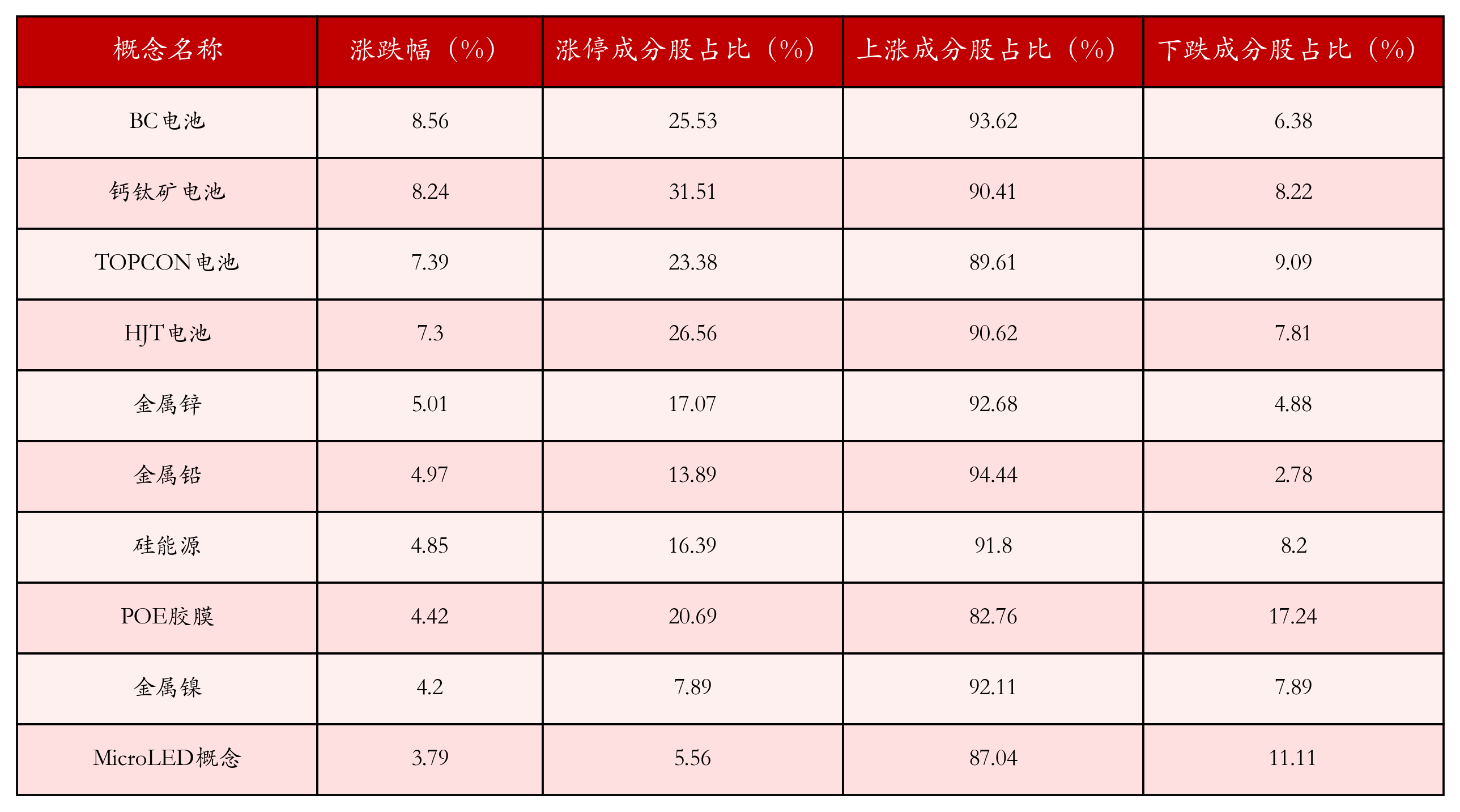 根据A股概念涨跌幅与所对应的股票池综合分析,涨幅靠前的三个概念板块分别为:BC电池、钙钛矿电池与TOPCON电池。排名前10位的概念板块相关数据见下表: