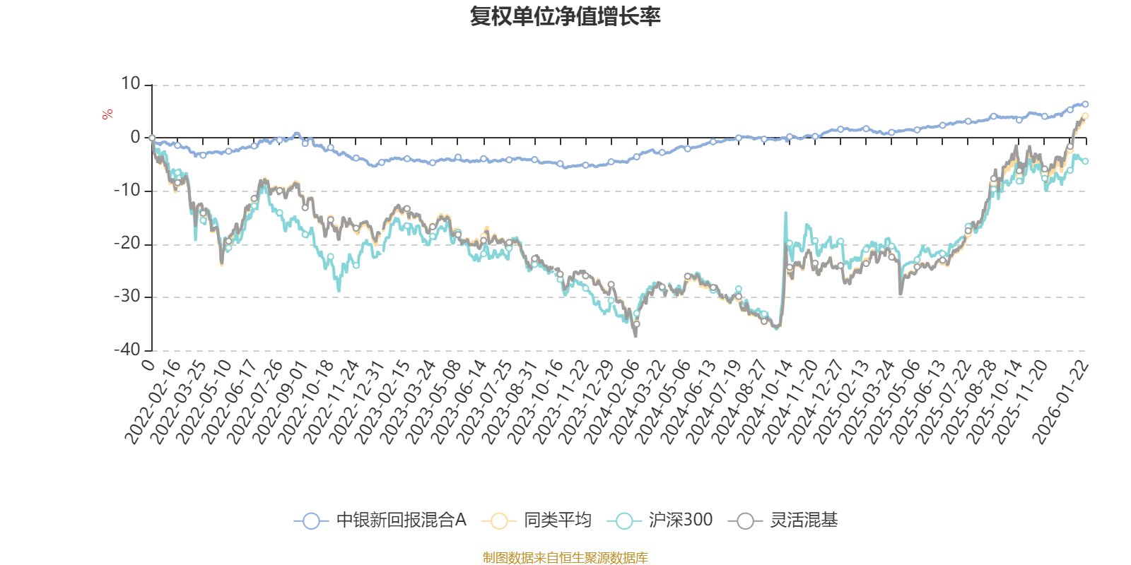 截至1月22日,中银新回报混合A近三个月复权单位净值增长率为2.35%,位于同类可比基金1020/1286;近半年复权单位净值增长率为3.10%,位于同类可比基金1130/1286;近一年复权单位净值增长率为4.82%,位于同类可比基金1207/1286;近三年复权单位净值增长率为10.52%,位于同类可比基金786/1286。