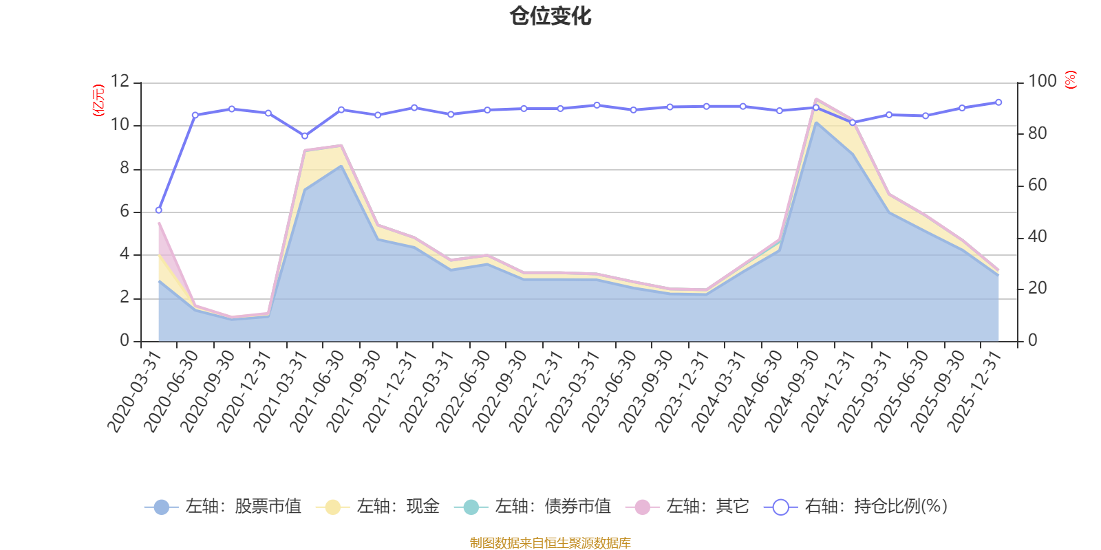 据定期报告数据统计,近三年平均股票仓位为89.5%,同类平均为86.12%。2025年末基金达到92.36%的最高仓位,2020年一季度末最低,为50.69%。