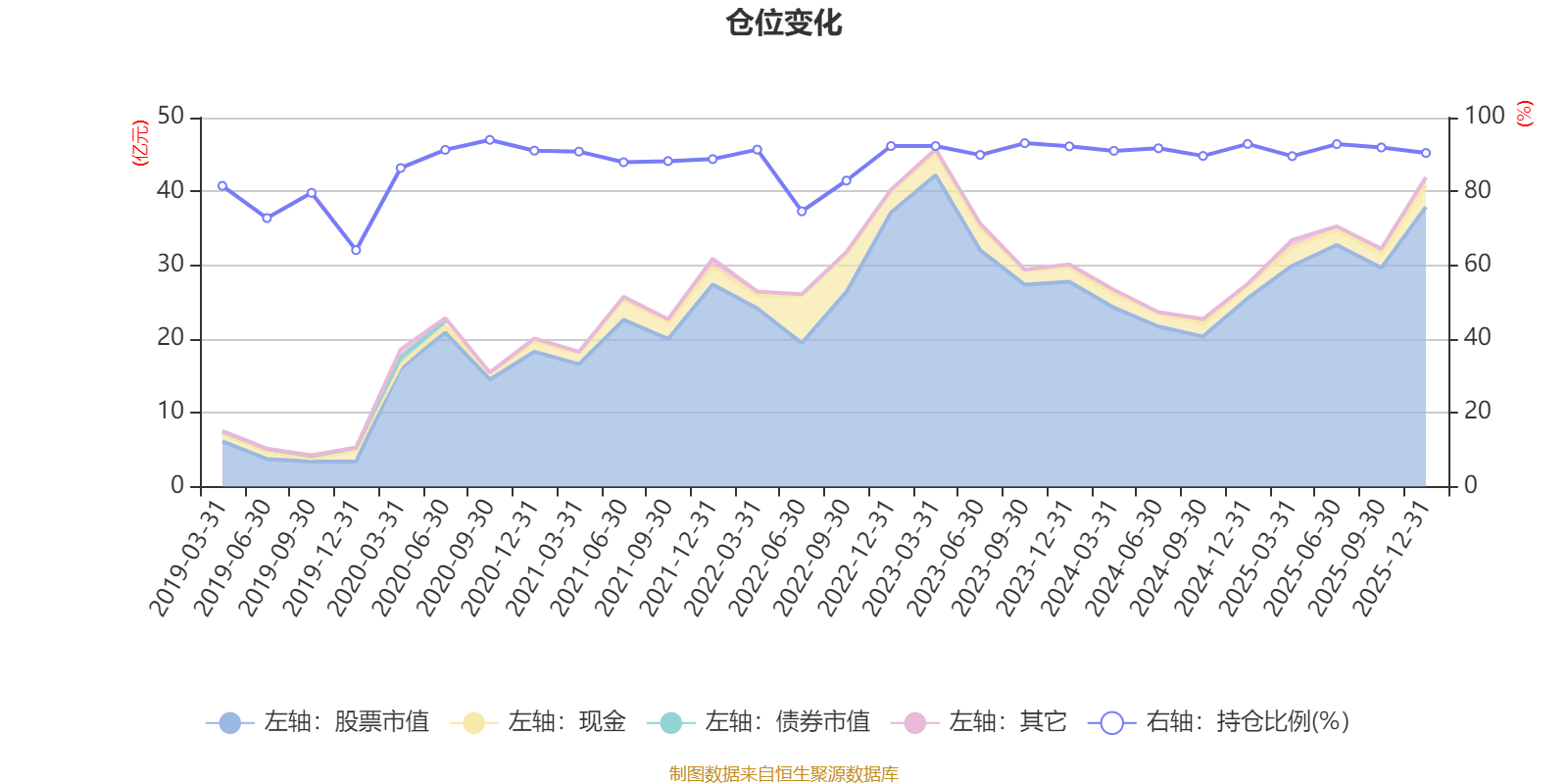 据定期报告数据统计,近三年平均股票仓位为91.44%,同类平均为72.57%。2020年三季度末基金达到93.97%的最高仓位,2019年末最低,为64.09%。
