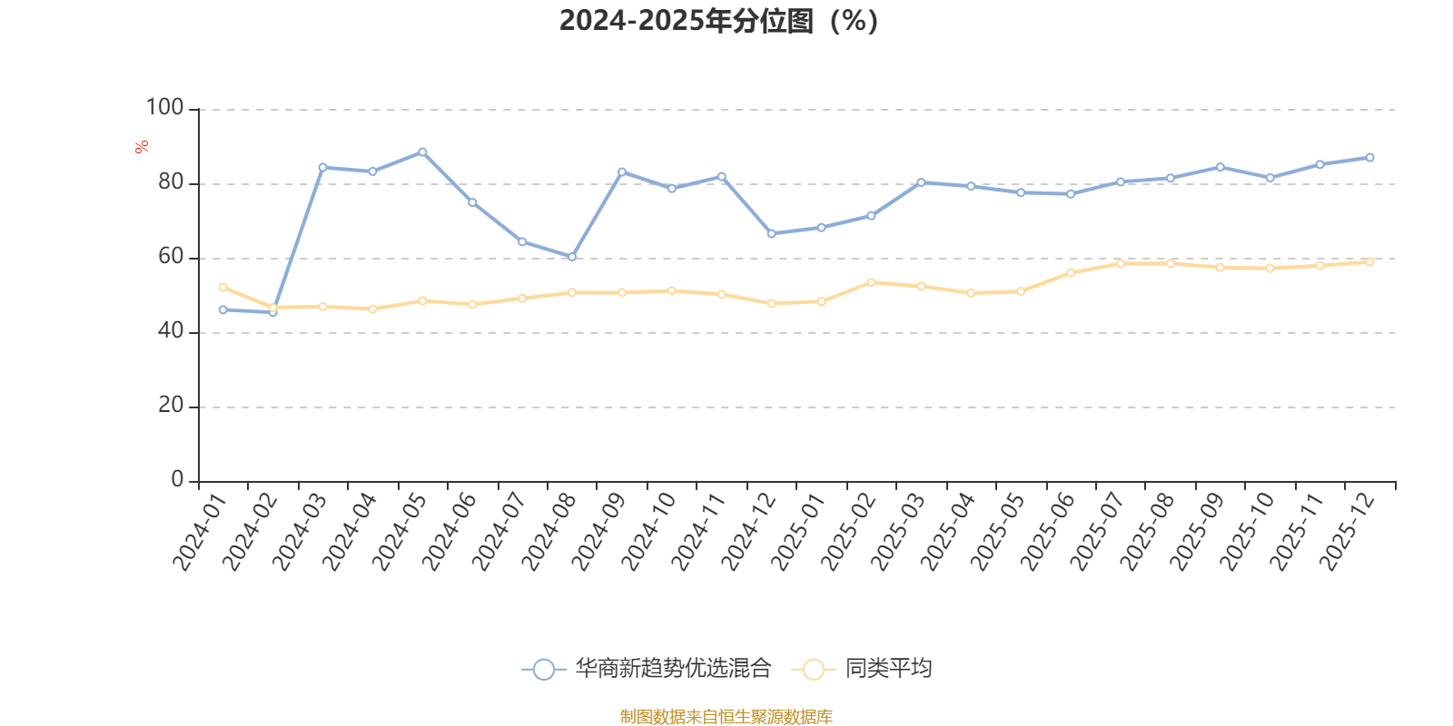通过所选区间该基金净值增长率分位图,可以观察该基金与同类基金业绩比较情况。图为坐标原点到区间内某时点的净值增长率在同类基金中的分位数。