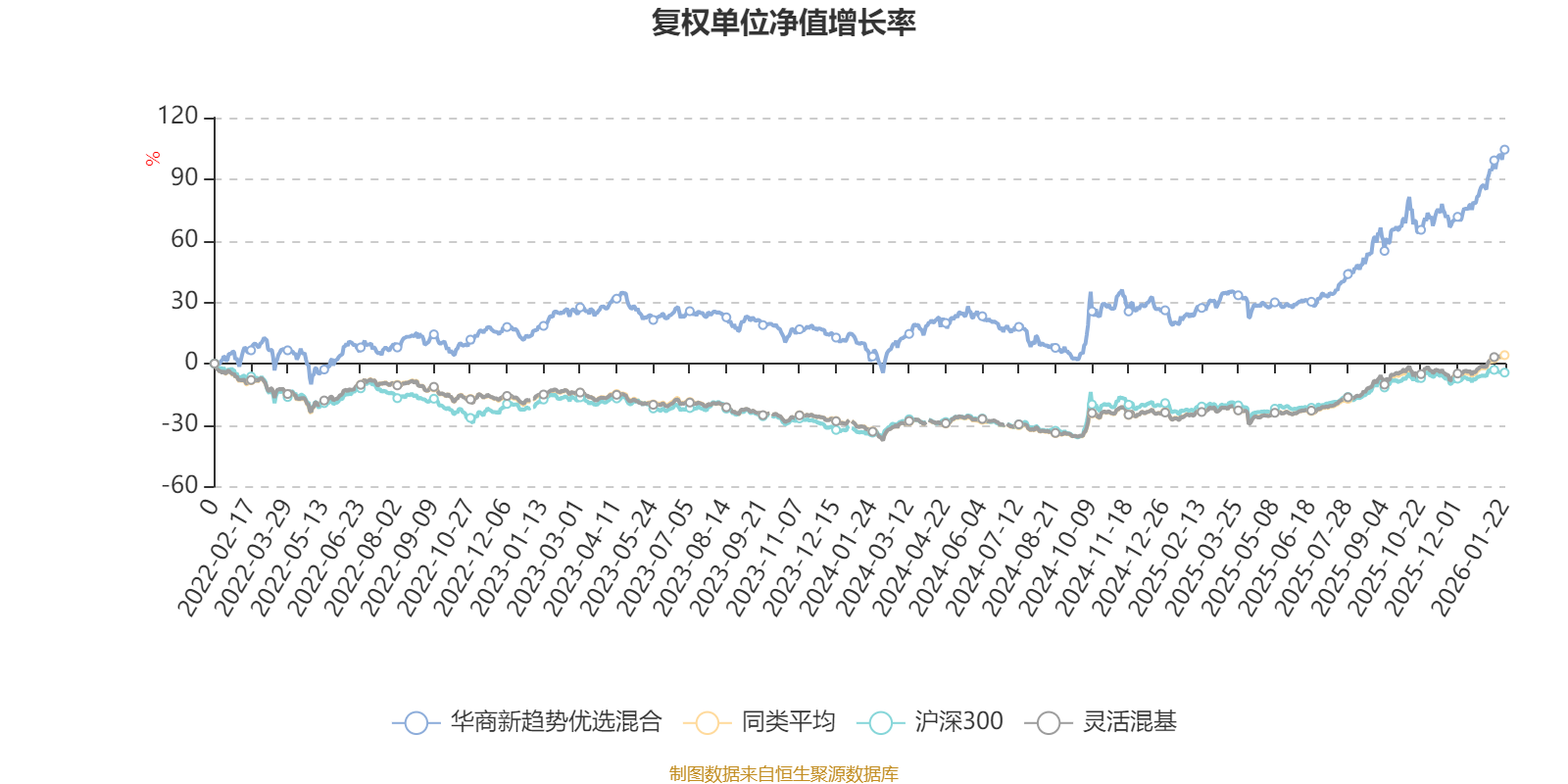 截至1月22日,华商新趋势优选混合近三个月复权单位净值增长率为23.68%,位于同类可比基金82/1286;近半年复权单位净值增长率为45.92%,位于同类可比基金192/1286;近一年复权单位净值增长率为65.42%,位于同类可比基金162/1286;近三年复权单位净值增长率为65.94%,位于同类可比基金100/1286。