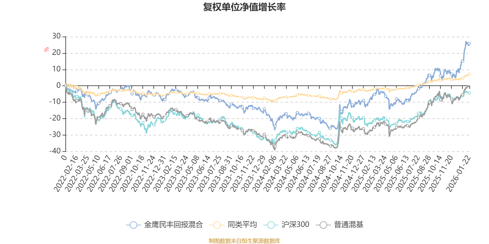 截至1月22日,金鹰民丰回报混合近三个月复权单位净值增长率为19.37%,位于同类可比基金4/629;近半年复权单位净值增长率为28.11%,位于同类可比基金6/629;近一年复权单位净值增长率为36.14%,位于同类可比基金10/626;近三年复权单位净值增长率为29.88%,位于同类可比基金31/564。