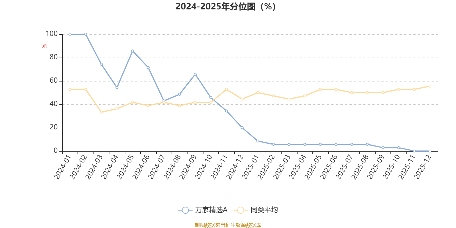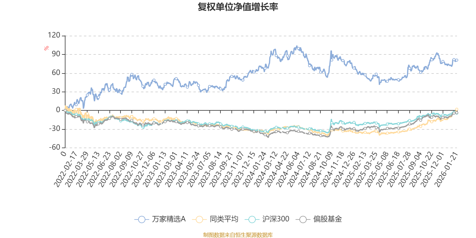 截至1月21日,万家精选A近三个月复权单位净值增长率为-1.77%,位于同类可比基金49/49;近半年复权单位净值增长率为14.19%,位于同类可比基金46/49;近一年复权单位净值增长率为14.27%,位于同类可比基金44/46;近三年复权单位净值增长率为23.89%,位于同类可比基金19/30。