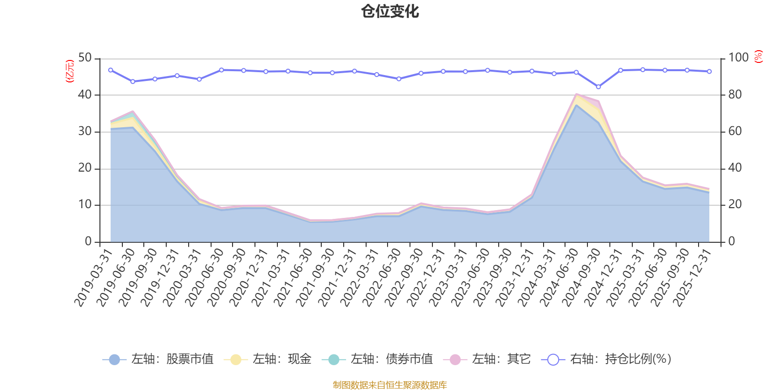 据定期报告数据统计,近三年平均股票仓位为92.38%,同类平均为86.41%。2025年一季度末基金达到93.9%的最高仓位,2024年三季度末最低,为84.59%。