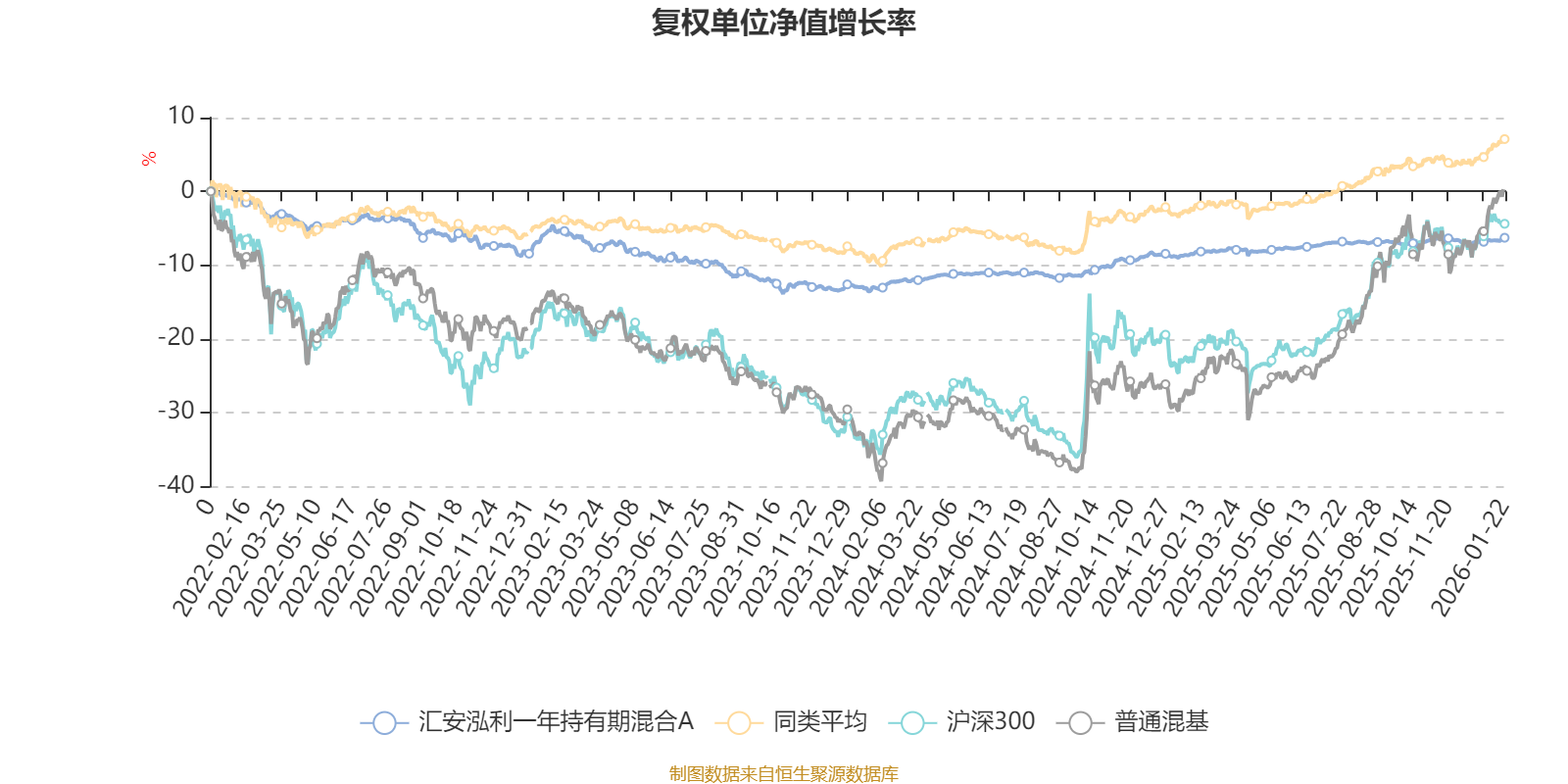 截至1月22日,汇安泓利一年持有期混合A近三个月复权单位净值增长率为0.65%,位于同类可比基金538/629;近半年复权单位净值增长率为0.56%,位于同类可比基金593/629;近一年复权单位净值增长率为2.63%,位于同类可比基金589/626;近三年复权单位净值增长率为-0.87%,位于同类可比基金540/564。