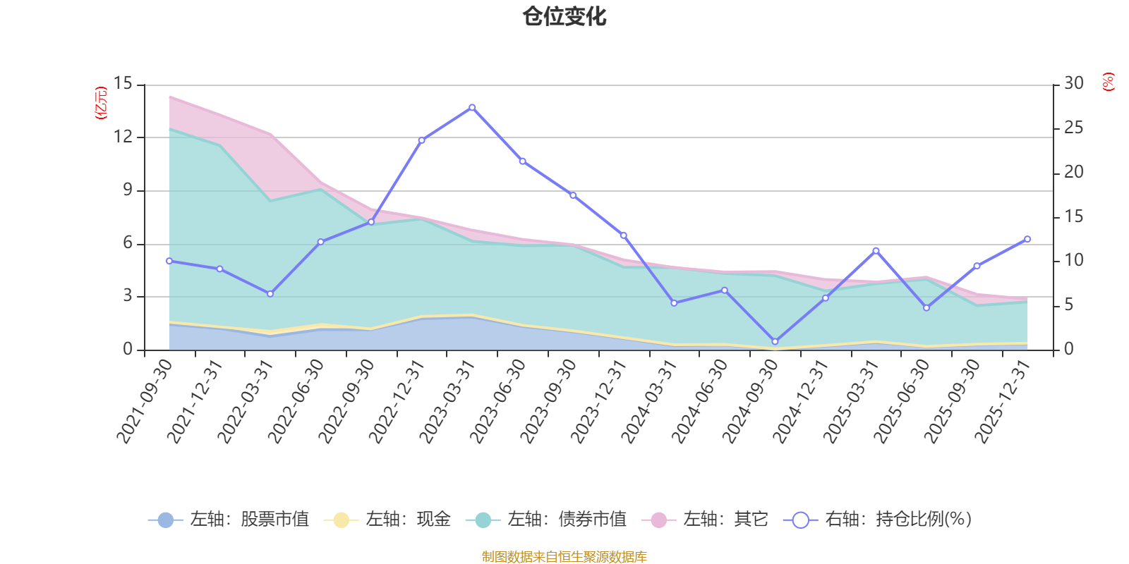 基金管理人在四季报中表示,报告期内,本基金秉持审慎稳健的增强策略。资产配置上,鉴于转债估值溢价较高,采取低配策略,维持中等水平的权益仓位。个股选择上,核心仓位聚焦现金流充沛、基本面扎实、股东回报稳定且估值合理的优质标的;同时,利用部分弹性仓位,在化工、非银金融、医药等板块积极捕捉阶段性交易机会。