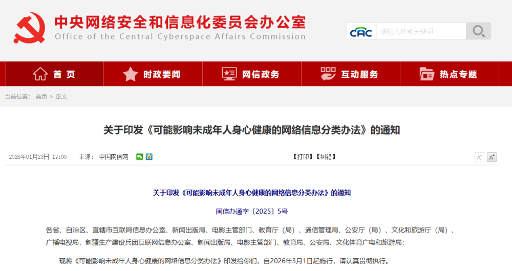 现将《可能影响未成年人身心健康的网络信息分类办法》印发给你们,自2026年3月1日起施行,请认真贯彻执行。