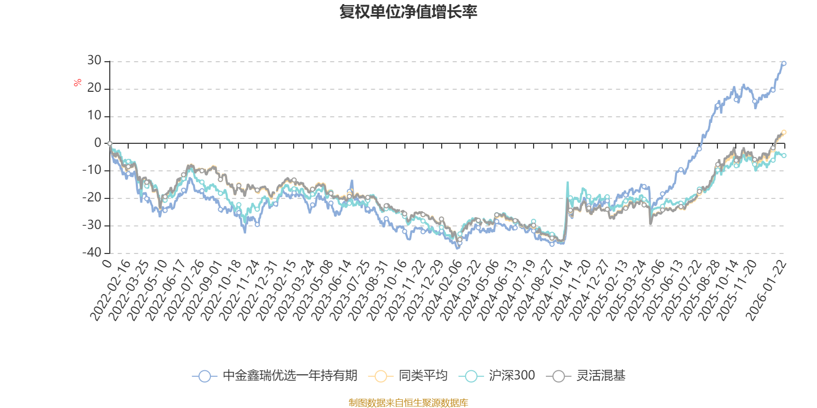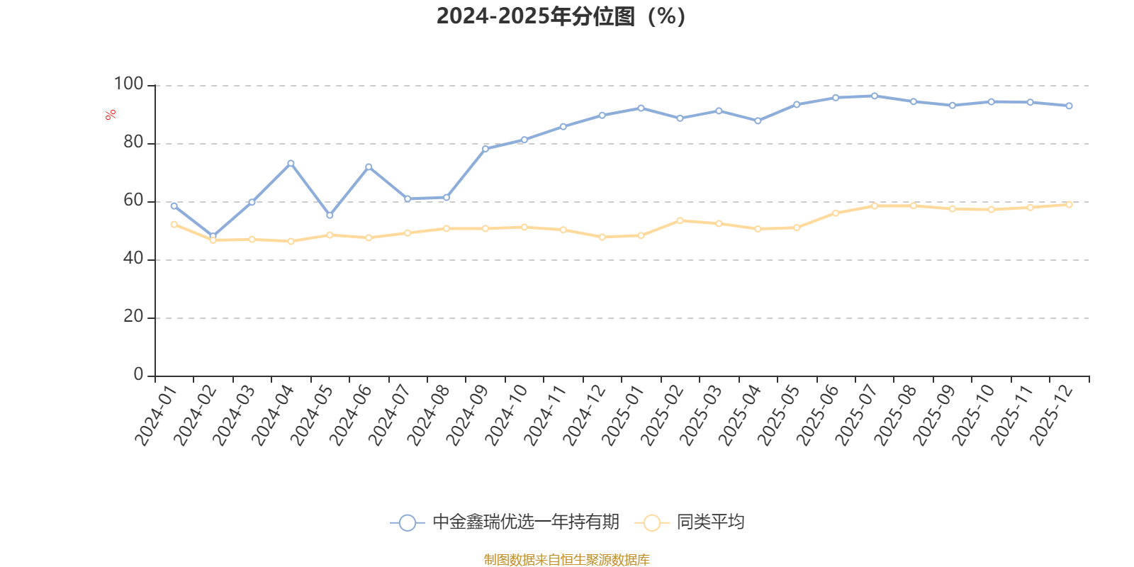 截至1月22日,中金鑫瑞优选一年持有期近三个月复权单位净值增长率为10.51%,位于同类可比基金543/1286;近半年复权单位净值增长率为31.78%,位于同类可比基金405/1286;近一年复权单位净值增长率为59.90%,位于同类可比基金209/1286;近三年复权单位净值增长率为58.06%,位于同类可比基金130/1286。