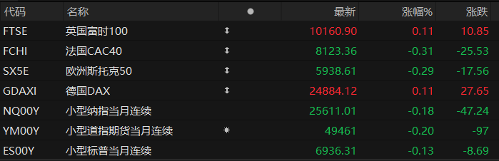 周五盘前,美股三大股指期货齐跌,欧洲主要指数涨跌不一。截至发稿,纳斯达克100指数期货跌0.18%,道指期货跌0.20%,标普500指数期货跌0.13%。