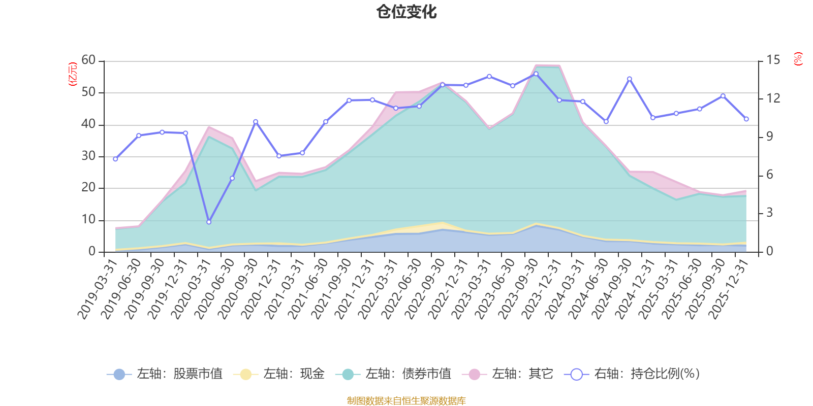 据定期报告数据统计,近三年平均股票仓位为11.98%,同类平均为72.57%。2023年三季度末基金达到13.99%的最高仓位,2020年一季度末最低,为2.35%。