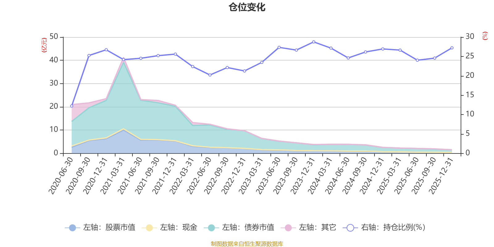据定期报告数据统计,近三年平均股票仓位为26.12%,同类平均为19.2%。2023年末基金达到28.75%的最高仓位,2020年上半年末最低,为12.2%。
