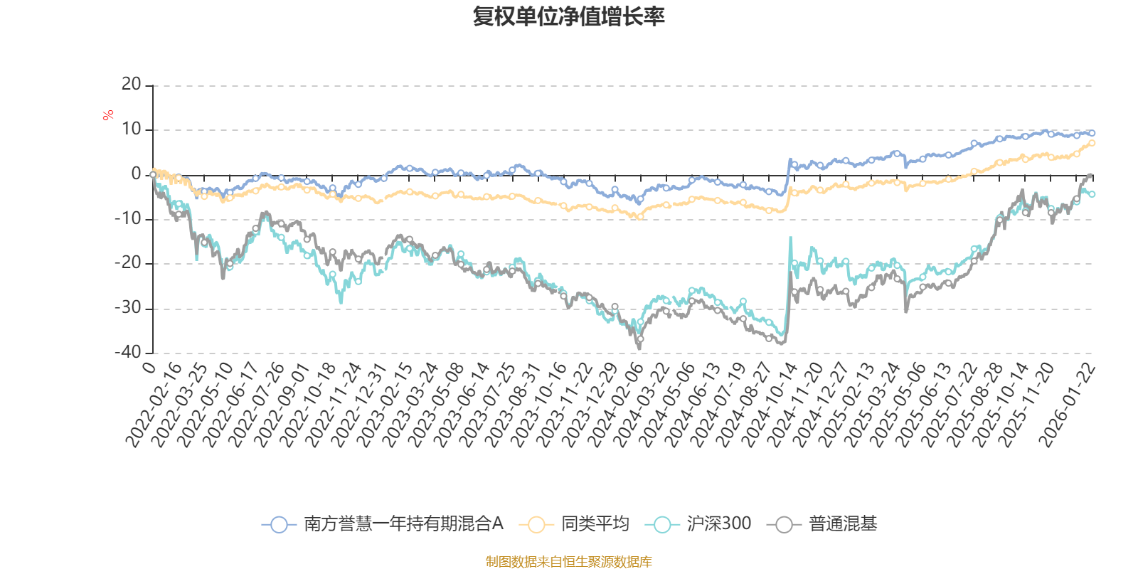 截至1月22日,南方誉慧一年持有期混合A近三个月复权单位净值增长率为0.56%,位于同类可比基金554/629;近半年复权单位净值增长率为2.12%,位于同类可比基金507/629;近一年复权单位净值增长率为7.04%,位于同类可比基金355/626;近三年复权单位净值增长率为7.50%,位于同类可比基金428/564。