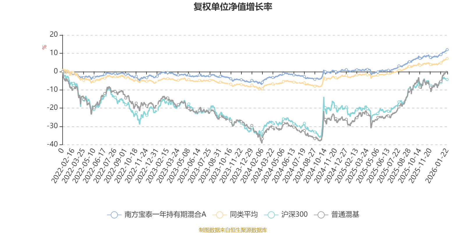 截至1月22日,南方宝泰一年持有期混合A近三个月复权单位净值增长率为4.29%,位于同类可比基金104/629;近半年复权单位净值增长率为8.61%,位于同类可比基金99/629;近一年复权单位净值增长率为11.49%,位于同类可比基金162/626;近三年复权单位净值增长率为12.42%,位于同类可比基金254/564。