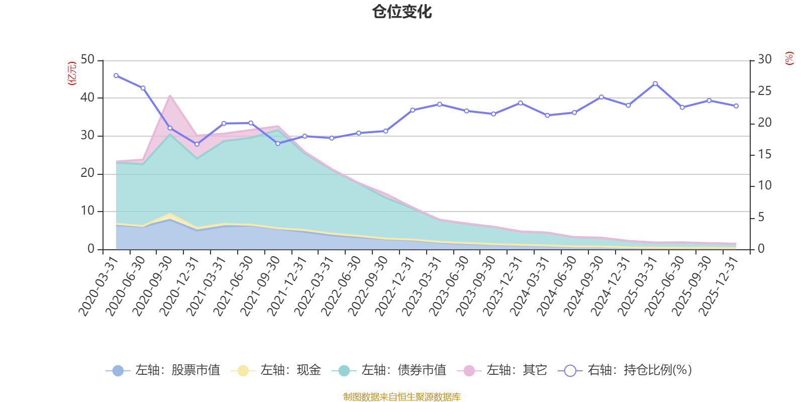 据定期报告数据统计,近三年平均股票仓位为22.92%,同类平均为19.2%。2020年一季度末基金达到27.58%的最高仓位,2020年末最低,为16.7%。