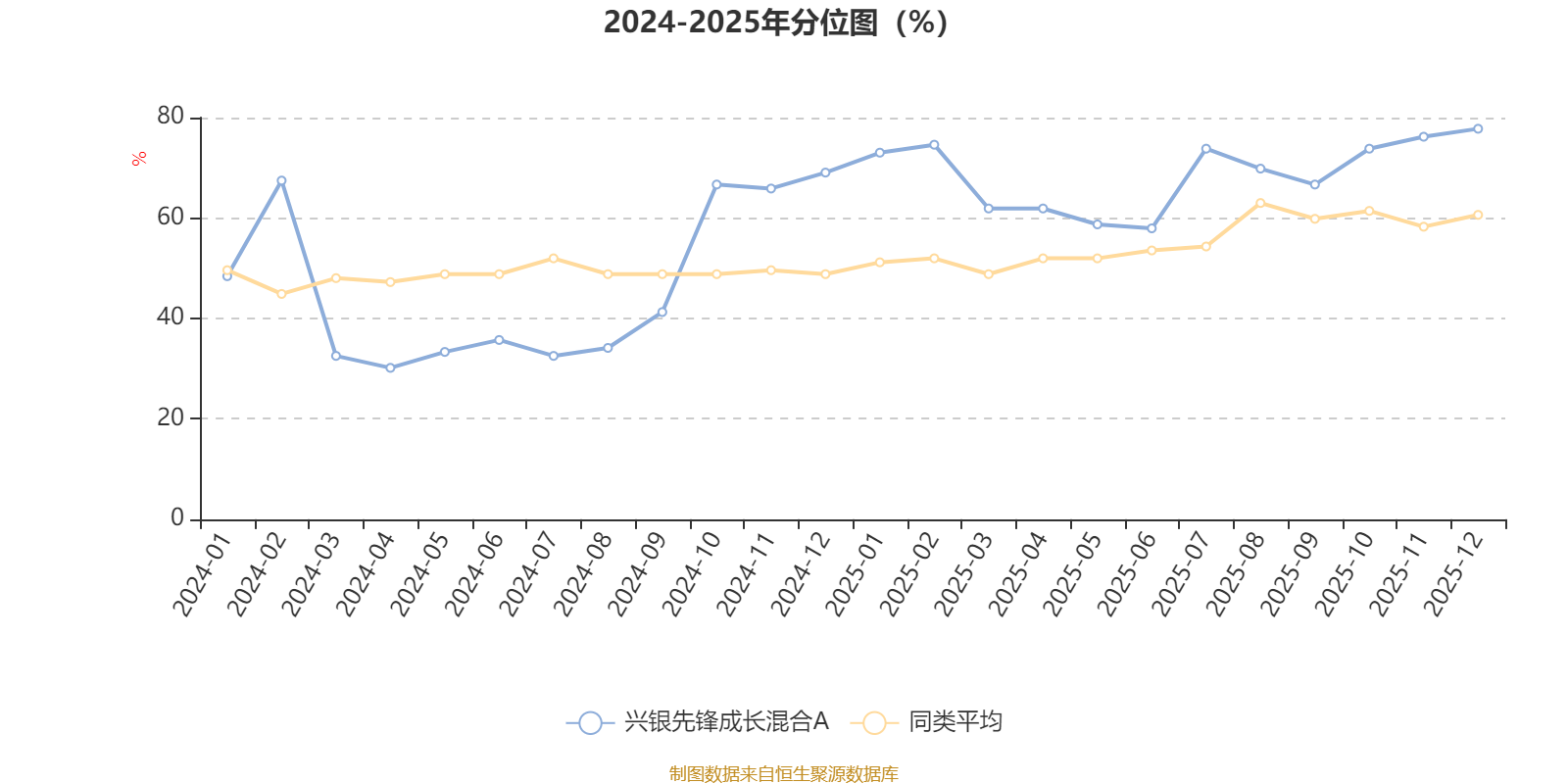 通过所选区间该基金净值增长率分位图,可以观察该基金与同类基金业绩比较情况。图为坐标原点到区间内某时点的净值增长率在同类基金中的分位数。