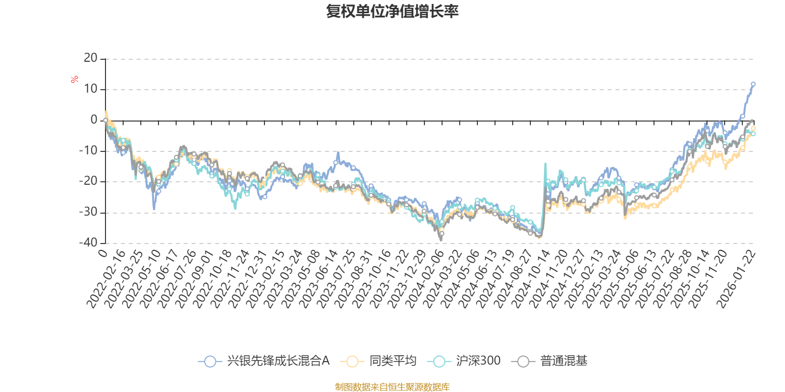 截至1月22日,兴银先锋成长混合A近三个月复权单位净值增长率为16.63%,位于同类可比基金21/134;近半年复权单位净值增长率为33.21%,位于同类可比基金29/134;近一年复权单位净值增长率为41.39%,位于同类可比基金33/131;近三年复权单位净值增长率为39.11%,位于同类可比基金20/124。