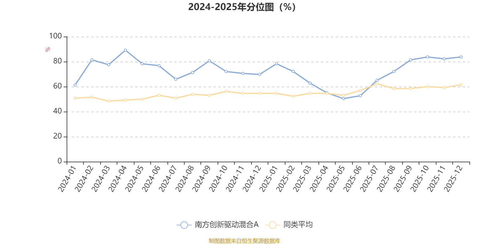 通过所选区间该基金净值增长率分位图,可以观察该基金与同类基金业绩比较情况。图为坐标原点到区间内某时点的净值增长率在同类基金中的分位数。
