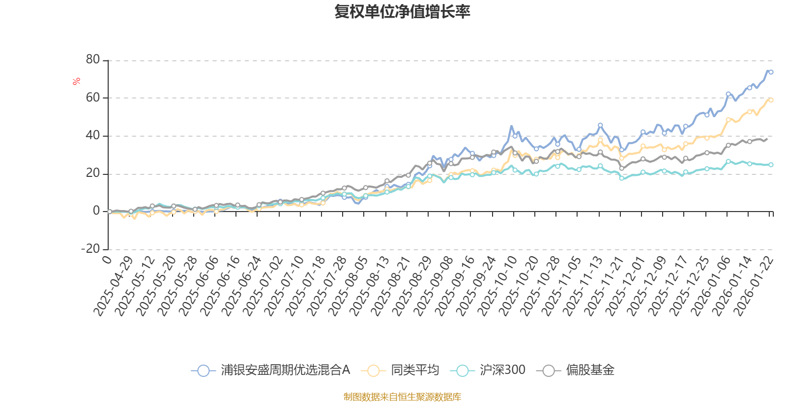 截至1月22日,浦银安盛周期优选混合A近三个月复权单位净值增长率为30.02%,位于同类可比基金16/49;近半年复权单位净值增长率为60.13%,位于同类可比基金14/49。