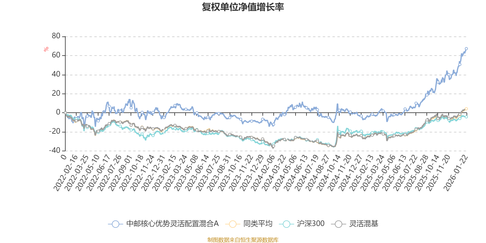 截至1月22日,中邮核心优势灵活配置混合A近三个月复权单位净值增长率为28.36%,位于同类可比基金50/1286;近半年复权单位净值增长率为52.11%,位于同类可比基金136/1286;近一年复权单位净值增长率为74.33%,位于同类可比基金92/1286;近三年复权单位净值增长率为60.74%,位于同类可比基金119/1286。