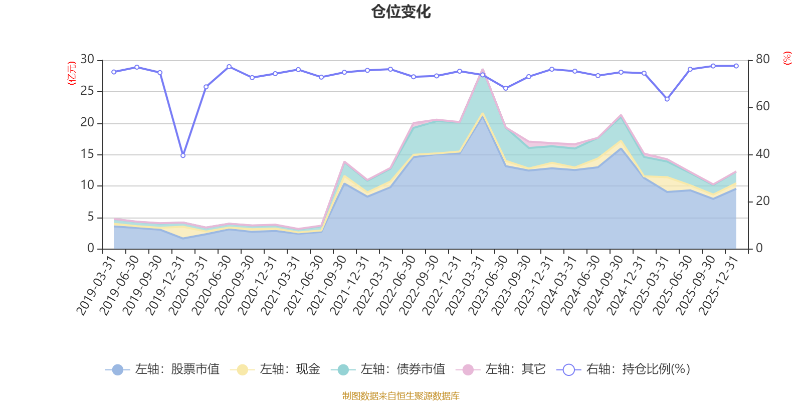 据定期报告数据统计,近三年平均股票仓位为73.66%,同类平均为72.57%。2025年末基金达到77.54%的最高仓位,2019年末最低,为39.56%。