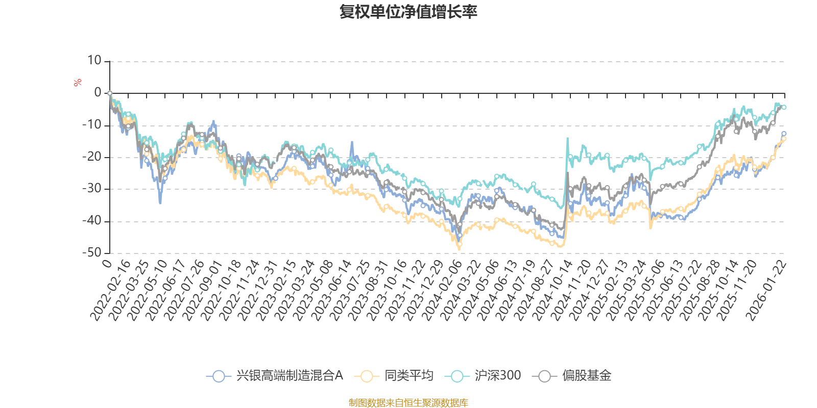 截至1月22日,兴银高端制造混合A近三个月复权单位净值增长率为17.11%,位于同类可比基金126/689;近半年复权单位净值增长率为30.68%,位于同类可比基金234/689;近一年复权单位净值增长率为32.49%,位于同类可比基金398/673;近三年复权单位净值增长率为12.14%,位于同类可比基金214/396。