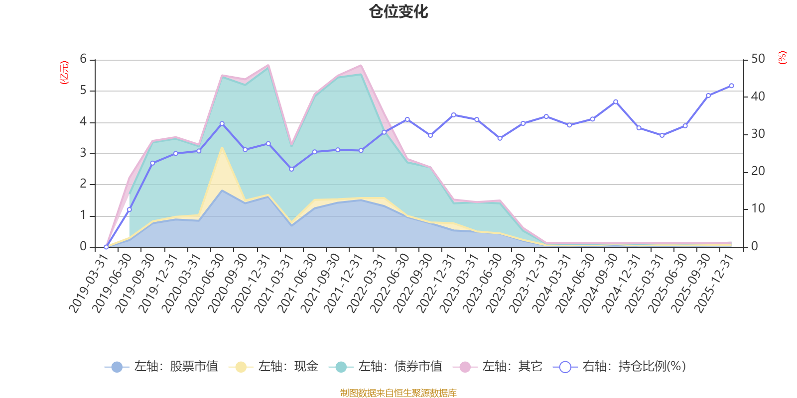 据定期报告数据统计,近三年平均股票仓位为34.49%,同类平均为72.57%。2025年末基金达到43.06%的最高仓位,2019年上半年末最低,为10%。