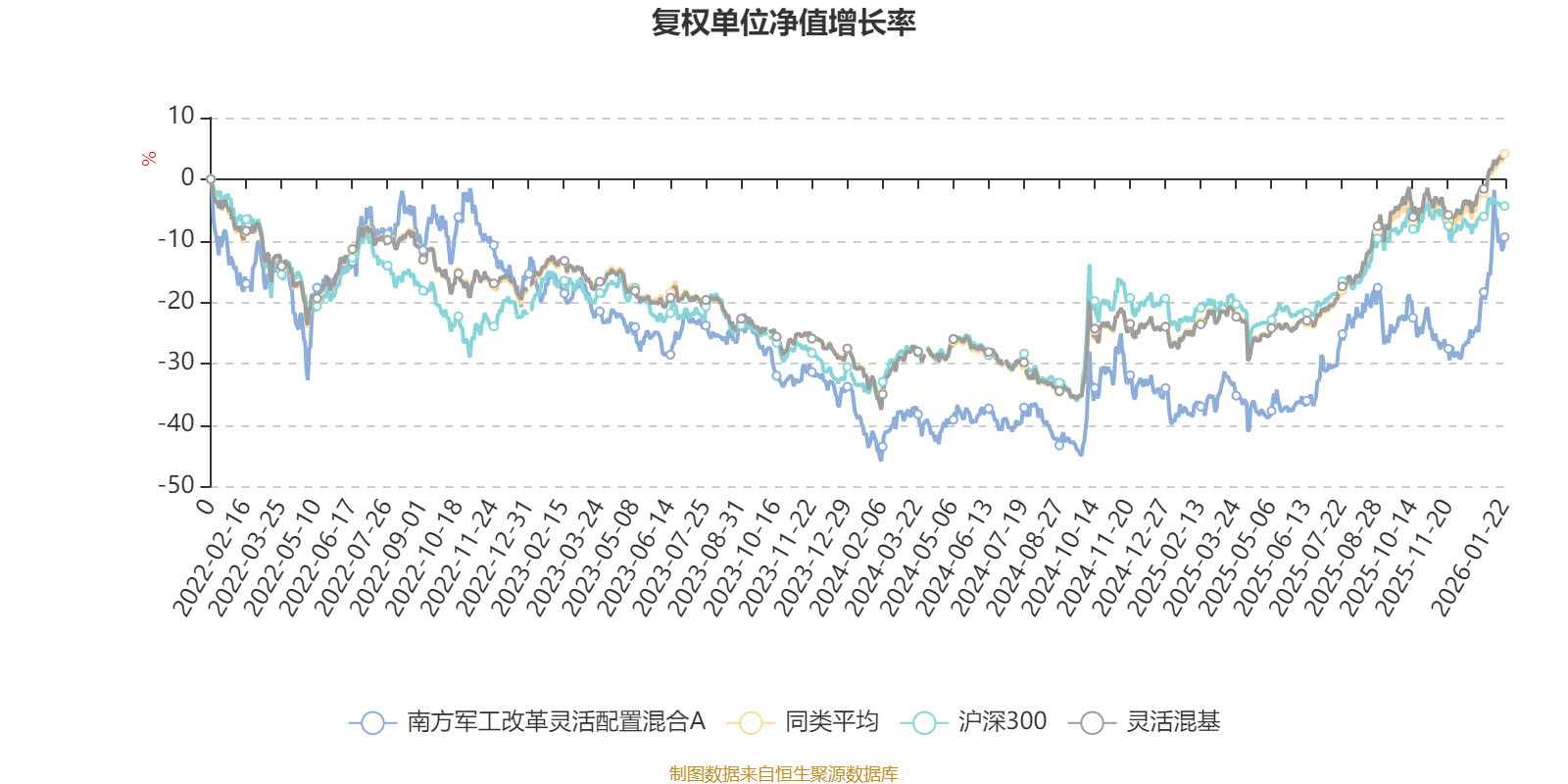 截至1月22日,南方军工改革灵活配置混合A近三个月复权单位净值增长率为20.17%,位于同类可比基金135/1286;近半年复权单位净值增长率为21.09%,位于同类可比基金657/1286;近一年复权单位净值增长率为46.34%,位于同类可比基金373/1286;近三年复权单位净值增长率为9.46%,位于同类可比基金813/1286。