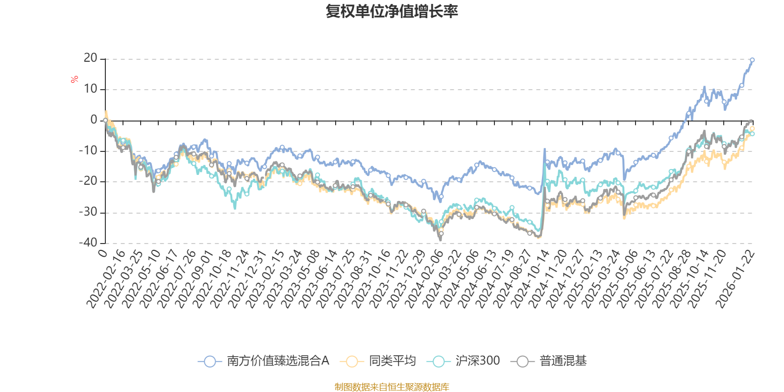 截至1月22日,南方价值臻选混合A近三个月复权单位净值增长率为12.69%,位于同类可比基金38/134;近半年复权单位净值增长率为26.95%,位于同类可比基金44/134;近一年复权单位净值增长率为39.09%,位于同类可比基金41/131;近三年复权单位净值增长率为32.92%,位于同类可比基金33/124。