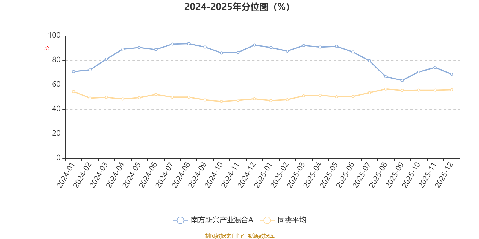 通过所选区间该基金净值增长率分位图,可以观察该基金与同类基金业绩比较情况。图为坐标原点到区间内某时点的净值增长率在同类基金中的分位数。