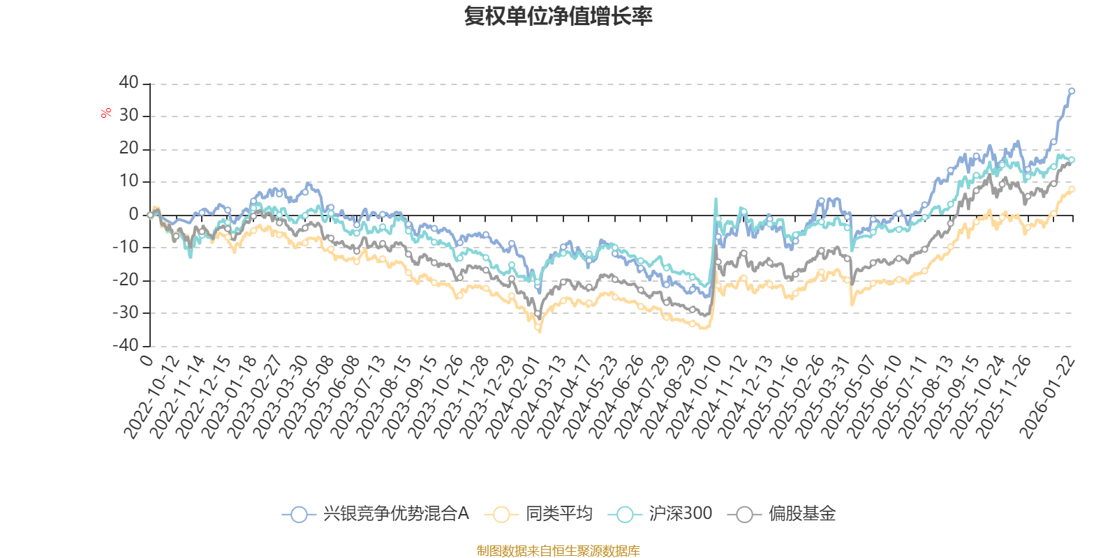 截至1月22日,兴银竞争优势混合A近三个月复权单位净值增长率为20.39%,位于同类可比基金74/689;近半年复权单位净值增长率为28.88%,位于同类可比基金267/689;近一年复权单位净值增长率为45.80%,位于同类可比基金245/673;近三年复权单位净值增长率为30.92%,位于同类可比基金112/396。